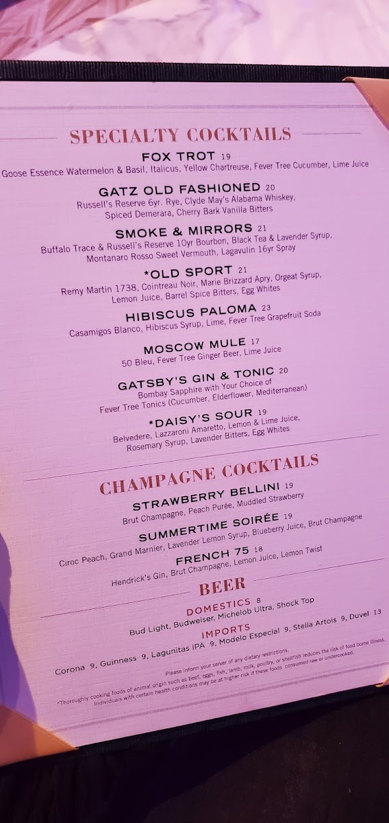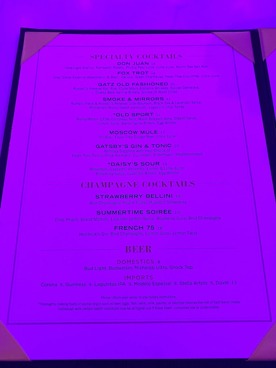 Welcome to Gatsby's Cocktail Lounge, a vibrant hotspot located at 3000 S Las Vegas Blvd, where elegance meets excitement. This lounge offers a curated menu featuring a stellar selection of cocktails, including the unforgettable “bathtub drink,” perfect for sharing or indulging solo. With a refreshing array of beers and premium spirits like Green Spot Irish Whiskey and Macallan Scotch, there's something for every discerning palate.